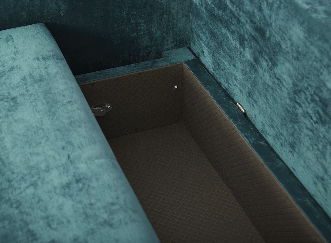 Боковые части конструкции при раскладывании выполняют поворот на 180 градусов. При этом ножки вместе с сиденьем двигаются по дуге и опускаются на напольное покрытие, открывая доступ к отделению для белья и укладки второй половины дивана. Чтобы предупредить перекосы во время трансформации в конструкцию мягкой мебели добавили специальную пружину и синхронизирующую штангу.