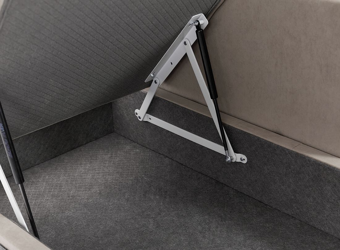 Механизм трансформации «аккордеон» представляет собой стальной каркас, на котором в определенном порядке расположены березовые латы, создающие ортопедический эффект. В разобранном виде получается полноценное, ровное спальное место.