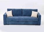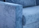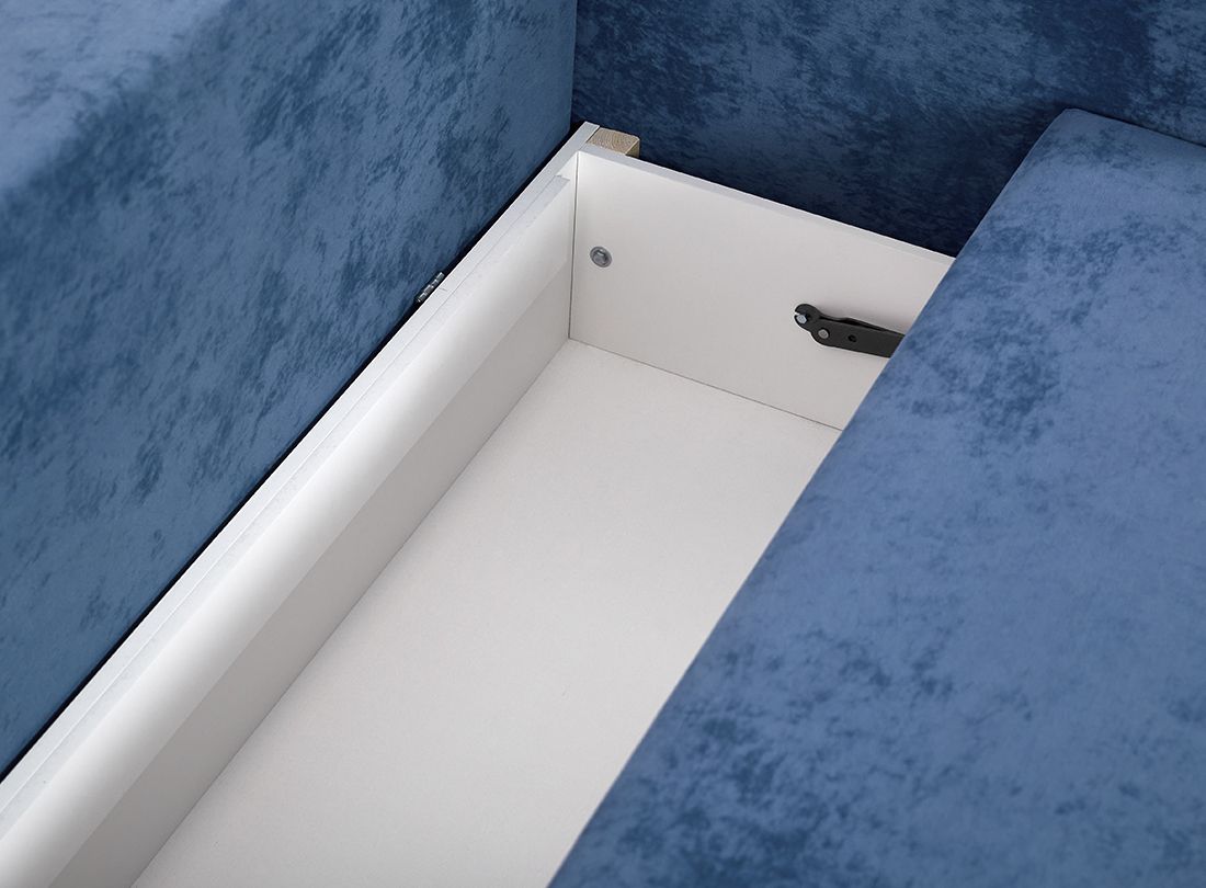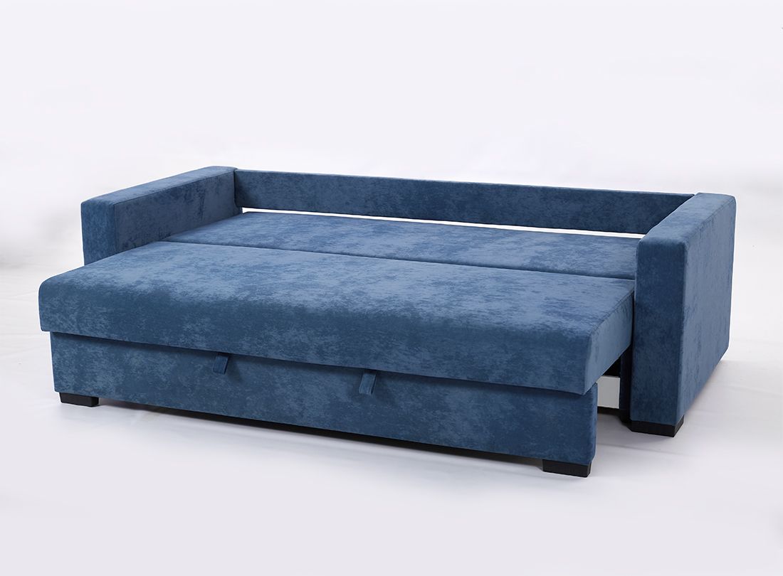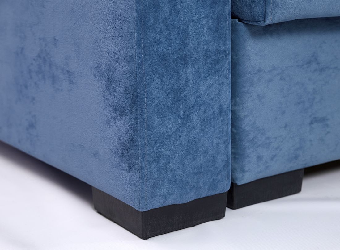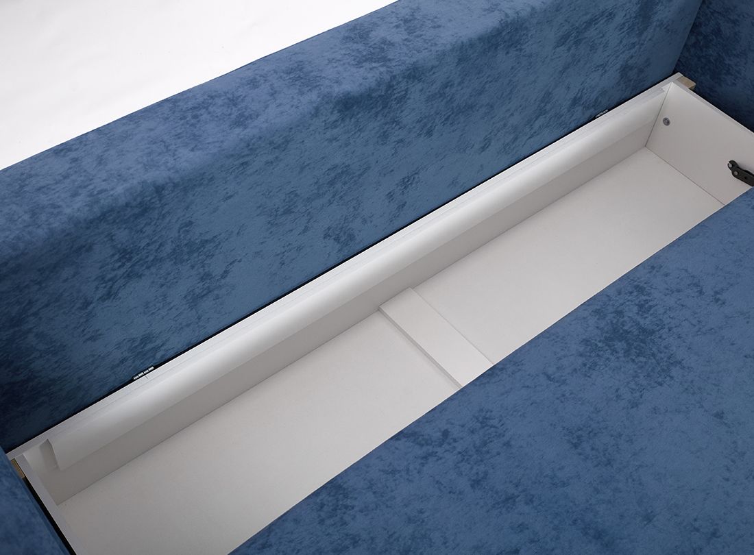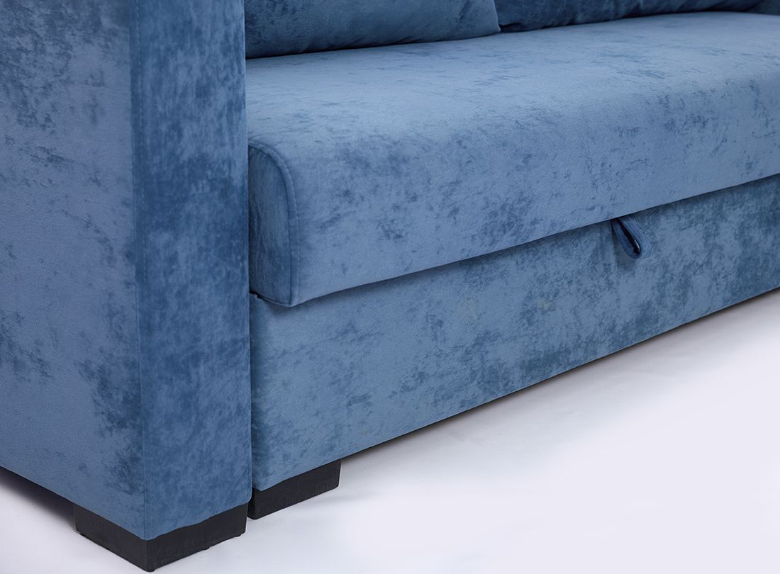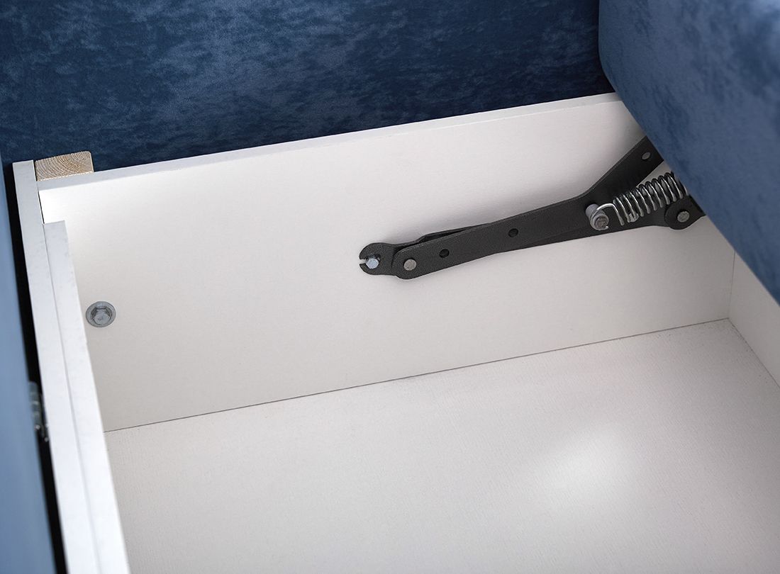 Боковые части конструкции при раскладывании выполняют поворот на 180 градусов. При этом ножки вместе с сиденьем двигаются по дуге и опускаются на напольное покрытие, открывая доступ к отделению для белья и укладки второй половины дивана. Чтобы предупредить перекосы во время трансформации в конструкцию мягкой мебели добавили специальную пружину и синхронизирующую штангу.